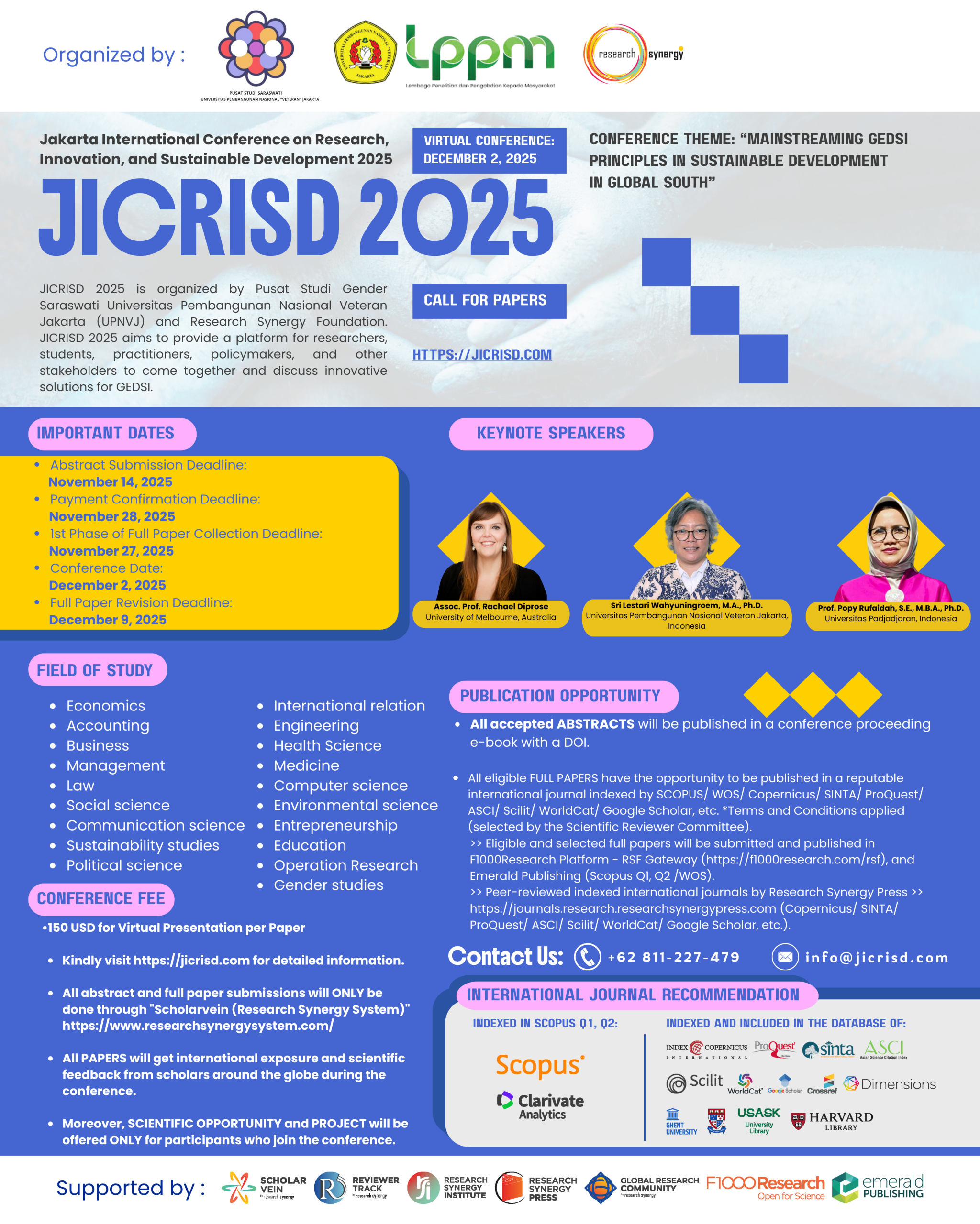 JICRISD 2025 is organized by Pusat Studi Gender Saraswati Universitas Pembangunan Nasional “Veteran” Jakarta, Universitas Pembangunan Nasional Veteran Jakarta (UPNVJ) and Research Synergy Foundation. JICRISD 2025 aims to promote international and regional collaboration, networking, and education in sustainable natural resources area. The conference aims to provide a platform for researchers, students, practitioners, policymakers, and other stakeholders to come together and discuss innovative solutions for GEDSI.